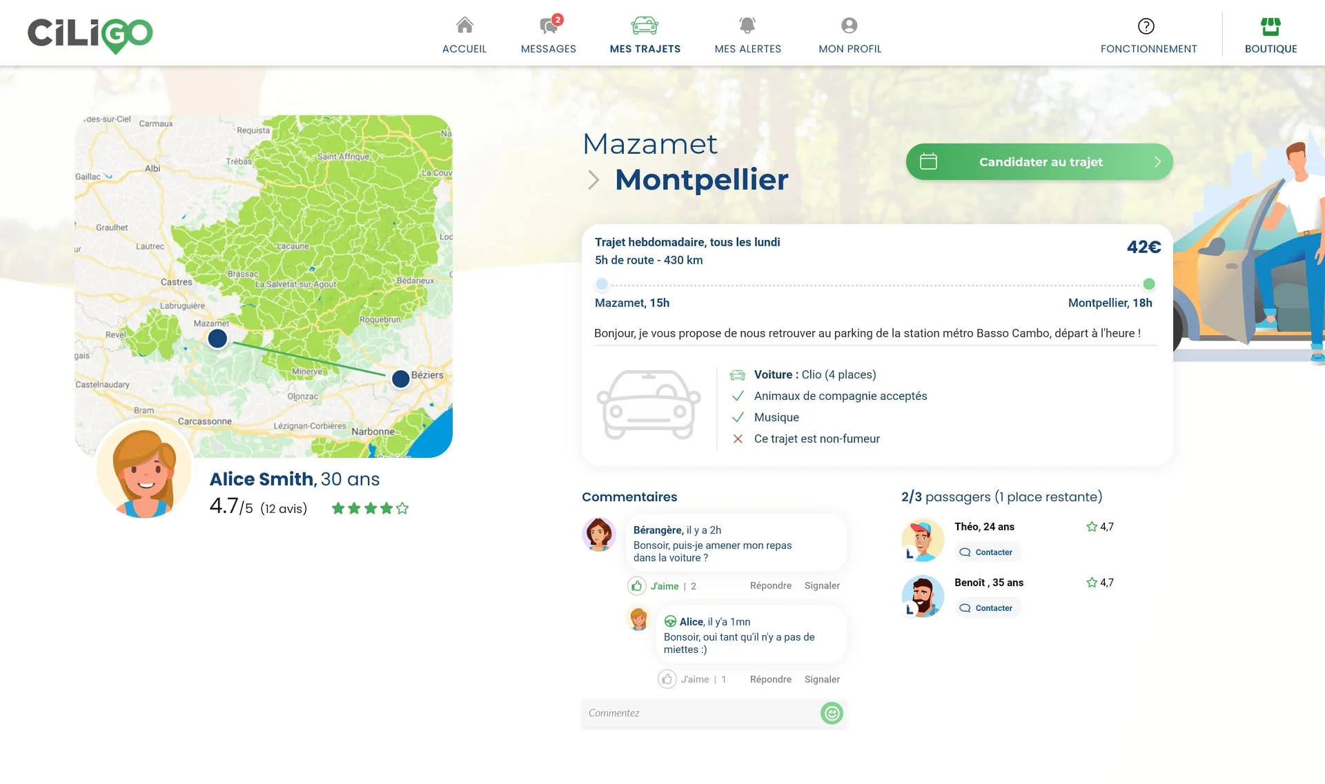 L'association Cilinnov nous a confié le développement complet de Ciligo, plateforme de covoiturage de proximité pour la Nouvelle-Aquitaine. L'objectif : répondre aux besoins de mobilité des zones rurales où les transports en commun sont peu adaptés aux horaires de travail. Nous avons développé une application unique fonctionnant sur mobile (iOS/Android) et web grâce à React Native Web, ainsi qu'un backoffice d'administration pour la gestion des utilisateurs et le reporting vers les entreprises partenaires.