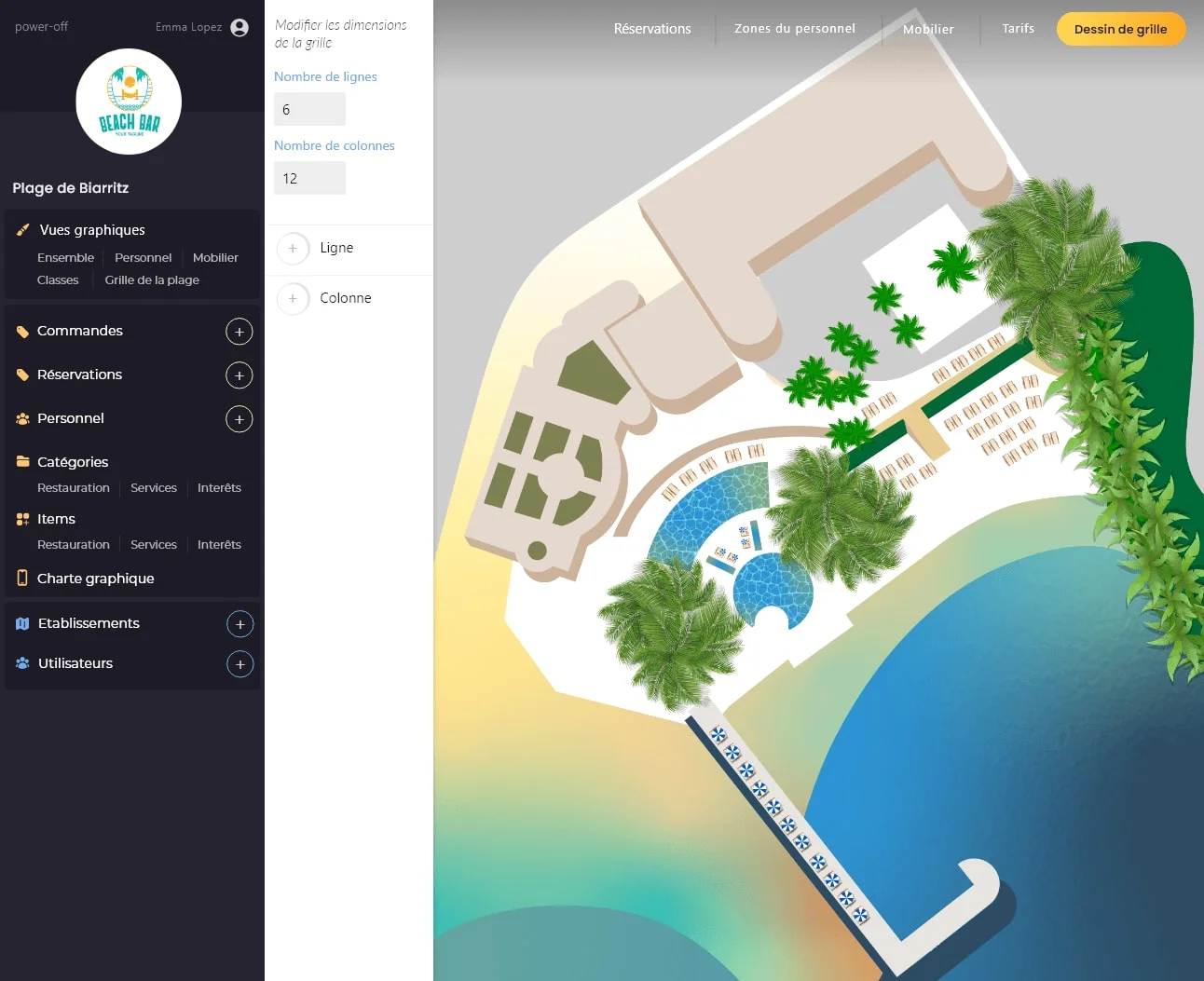 Interface d'administration complète pour configurer l'établissement : création du plan interactif, gestion du catalogue produits et services, paramétrage des tarifs et disponibilités, suivi des réservations et reporting des ventes.